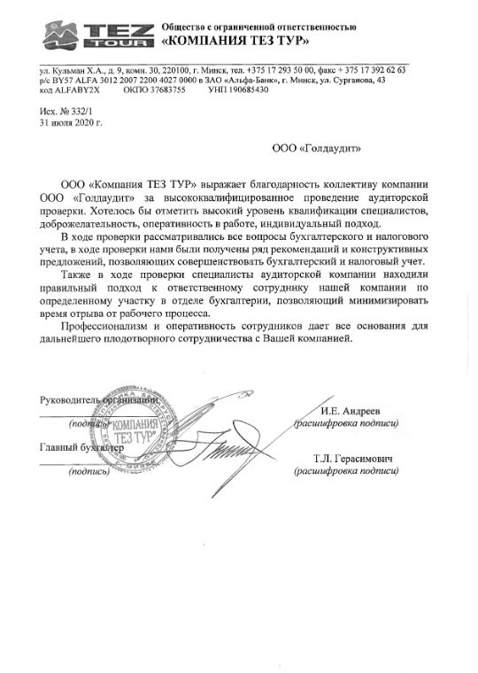 ОДО "ПОЛИКОНТА" выражает огромную благодарность за высококвалифицированное проведение аудиторской проверки.