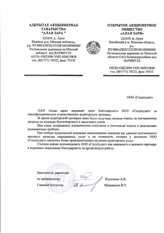 ОАО "Алая Заря" выражает благодарность за квалифицированную и качественную аудиторскую проверку.