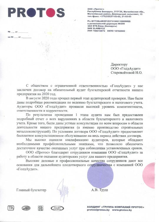 ООО "Протос" высоко оценивает квалификацию аудиторов "ГолдАудит", что позволило обеспечить качество оказанных услуг при соблюдении установленных сроков.